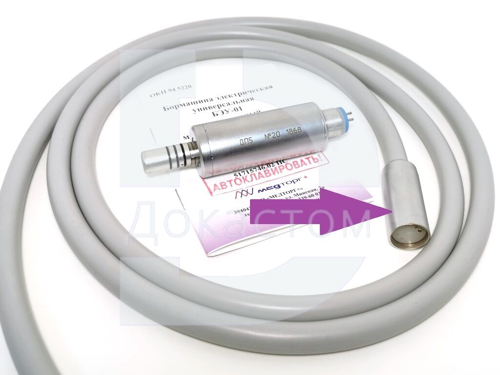 Шланг предназначен для подключения коллекторного микродвигателя постоянного тока ДП-5 к стоматологической установке. Обеспечивает подачу напряжения питания на двигатель, подачу воды и сжатого воздуха в соответствующие каналы двигателя для создания спрея на моторном стоматологическом наконечнике.